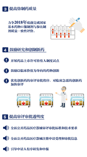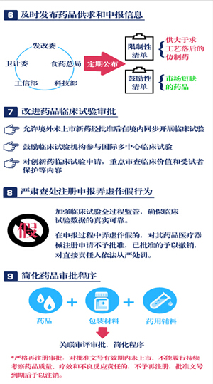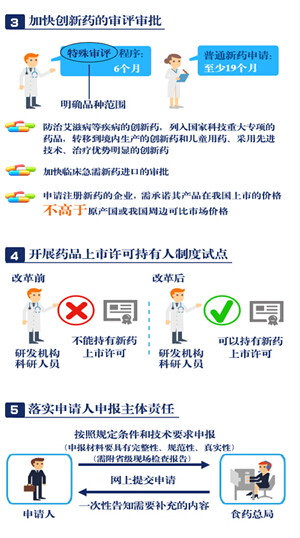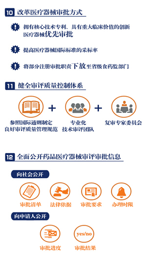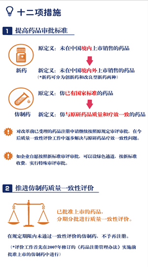 《意見》明確了改革的12項任務,包括提高藥品審批標準,推進仿制藥質(zhì)量一致性評價,加快創(chuàng)新藥的審評審批,開展藥品上市許可持有人制度試點,落實申請人申報主體責任,及時發(fā)布藥品供求和申報信息,改進藥品臨床試驗審批,嚴肅查處注冊申報弄虛作假行為,簡化藥品審批程序、完善藥品再注冊制度,改革醫(yī)療器械審批方式,健全審評質(zhì)量控制體系,全面公開藥品醫(yī)療器械審評審批信息。