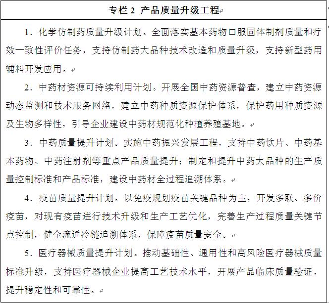 推動重點(diǎn)領(lǐng)域質(zhì)量提升。全面提升基本藥物質(zhì)量水平,落實(shí)仿制藥質(zhì)量和療效一致性評價要求,完成國家基本藥物口服固體制劑的一致性評價任務(wù)。完善中藥質(zhì)量標(biāo)準(zhǔn)體系,提升中藥全產(chǎn)業(yè)鏈質(zhì)量控制水平,提高產(chǎn)品質(zhì)量均一性和可控性。實(shí)施國家醫(yī)療器械標(biāo)準(zhǔn)提高行動計劃,開展與國際標(biāo)準(zhǔn)對標(biāo),制定在用醫(yī)療器械檢驗技術(shù)要求,推動企業(yè)改進(jìn)產(chǎn)品設(shè)計、制造工藝和質(zhì)量控制,提升醫(yī)療設(shè)備的穩(wěn)定性和可靠性。加強(qiáng)藥用輔料和直接接觸藥品的包裝材料和容器的標(biāo)準(zhǔn)體系建設(shè),增加國家標(biāo)準(zhǔn)收載品種,鼓勵企業(yè)提高規(guī)范生產(chǎn)能力,提升質(zhì)量控制水平。推動企業(yè)建立完善測量管理體系,促進(jìn)提質(zhì)增效。