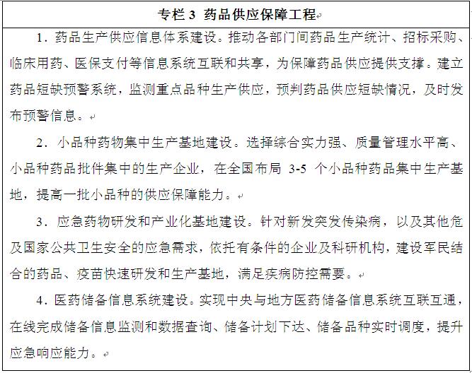 ——供應(yīng)保障。國家基本藥物、常用低價藥供應(yīng)保障能力加強(qiáng),臨床用藥短缺情況明顯改善,臨床急需的專利到期藥物基本實(shí)現(xiàn)仿制上市,國家醫(yī)藥儲備體系進(jìn)一步完善,應(yīng)對突發(fā)公共衛(wèi)生事件的應(yīng)急研發(fā)和應(yīng)急生產(chǎn)能力顯著增強(qiáng)。