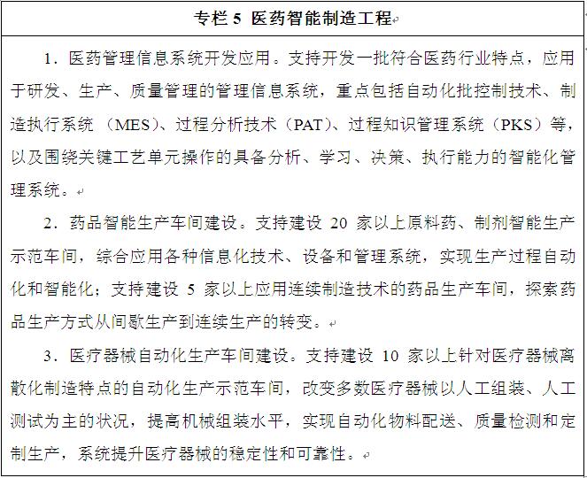 ——智能制造。到2020年,醫(yī)藥生產(chǎn)過程自動化、信息化水平顯著提升,大型企業(yè)關(guān)鍵工藝過程基本實(shí)現(xiàn)自動化,制造執(zhí)行系統(tǒng)(MES)使用率達(dá)到30%以上,建成一批智能制造示范車間。